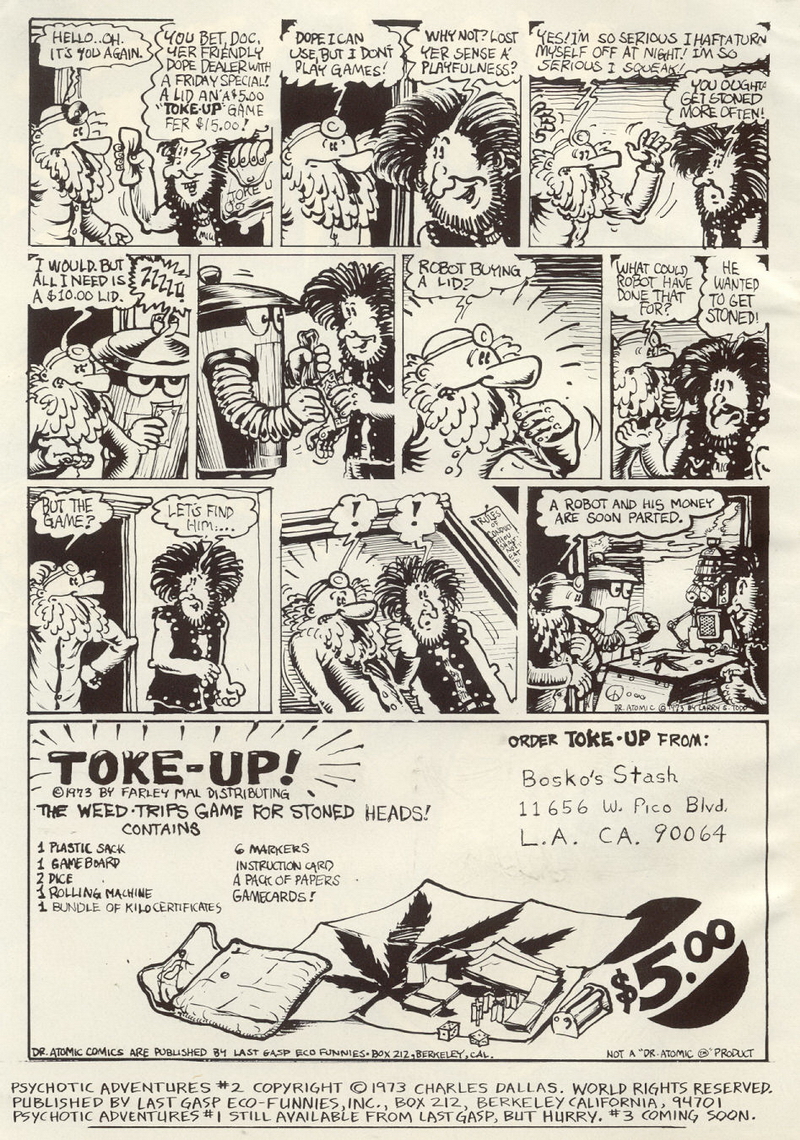 After the debut of Psychotic Adventures Illustrated, publisher Company & Sons fell on hard times (well, they were barely ever out of hard times) and soon went out of business. But Ron Turner and Last Gasp picked up the title created by Charles Dallas and published a second issue, printing 5,000 more copies than were printed of the first.