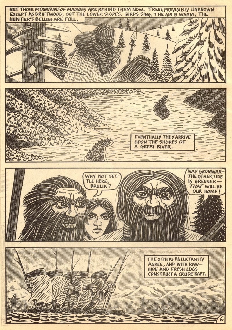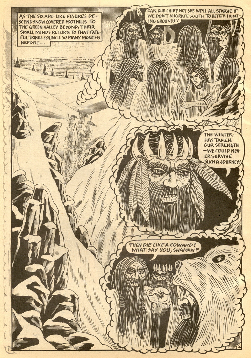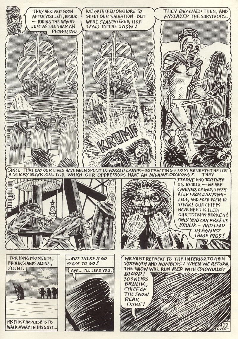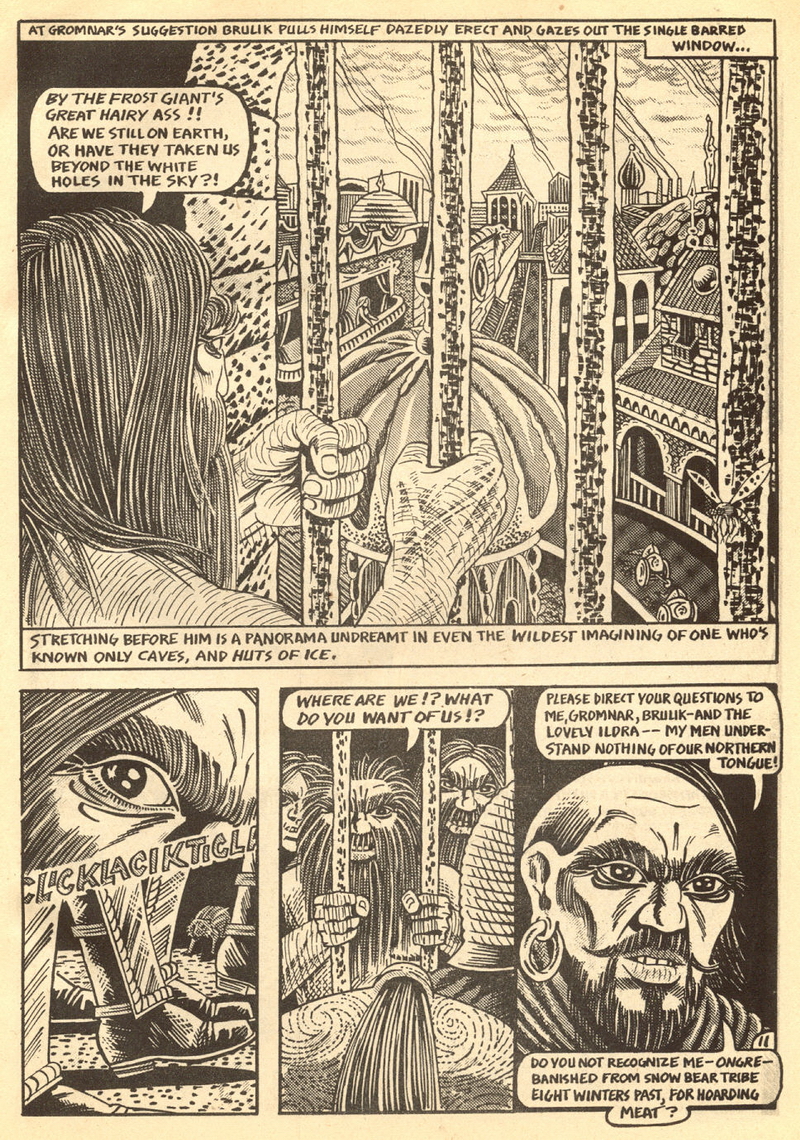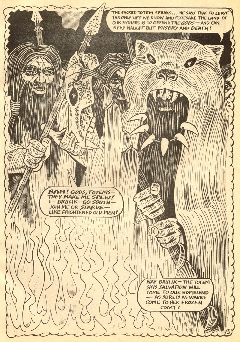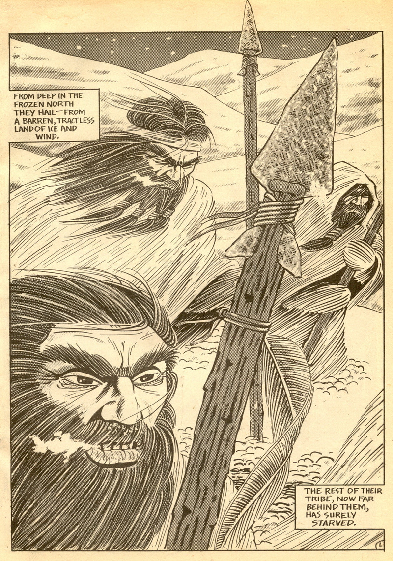 Psychotic Adventures #2 features a single, untitled story that’s fairly unique in Dallas’ body of work. It’s about a small group of a primitive arctic tribe (the Snow Bear Tribe) who acrimoniously split off from their tribemates to venture south and find better hunting grounds. Their long journey is grueling, dangerous and deadly: the group dwindles from ten to six and eventually down to three. When the surviving members, Brulik, Gromnar and Ildra, finally reach a more bountiful land, they are soon captured and held prisoner by a (relatively) technologically advanced civilization known as “the city-state of Xamon.”