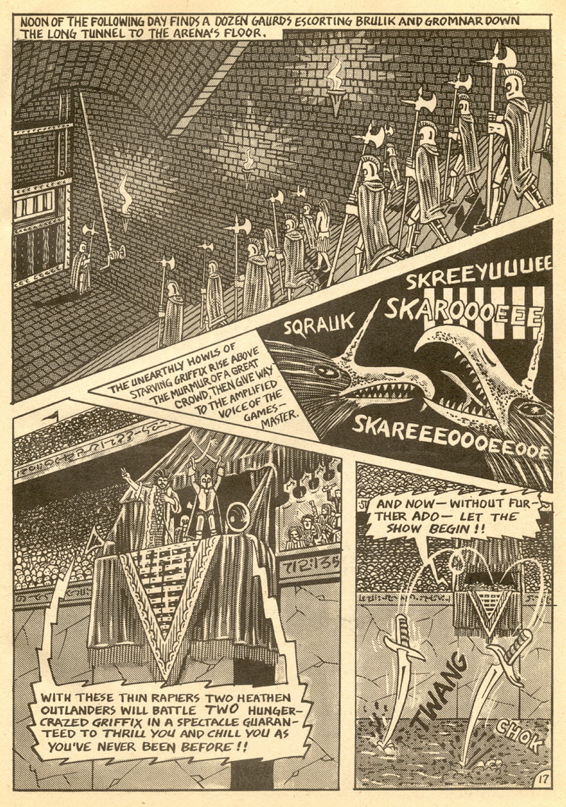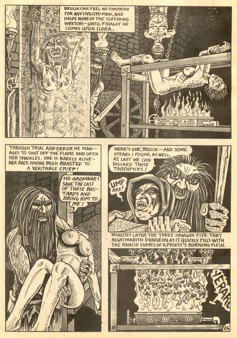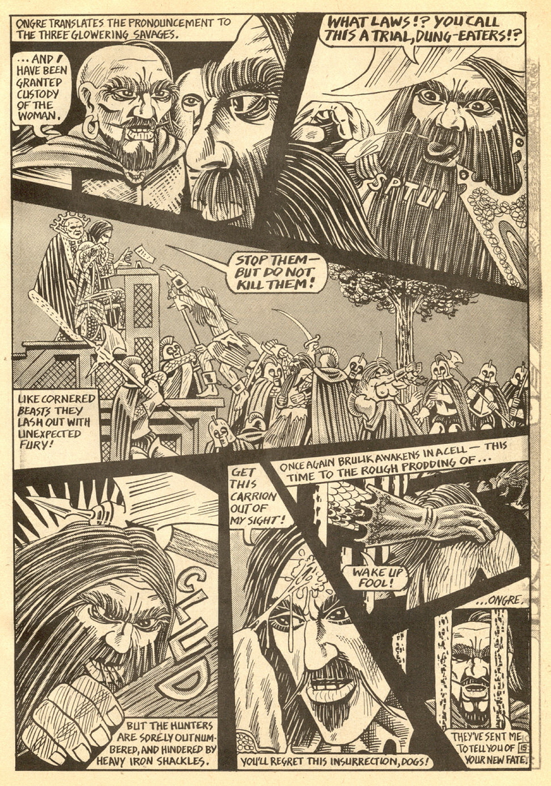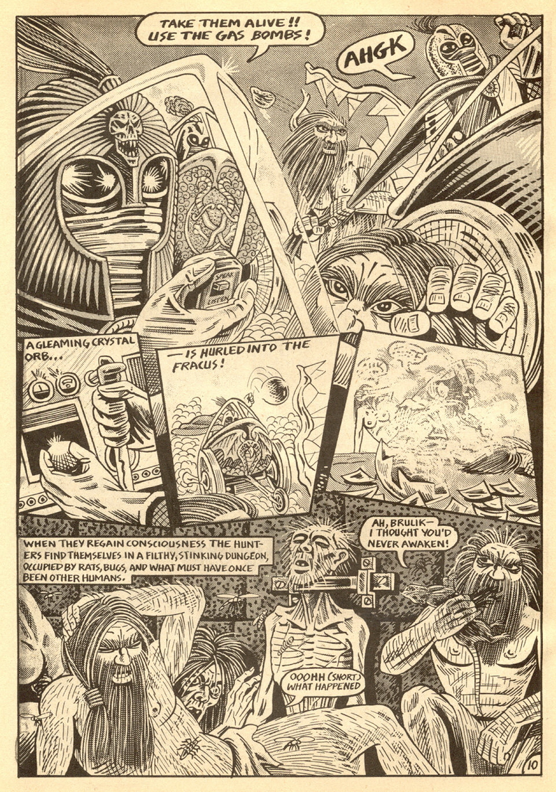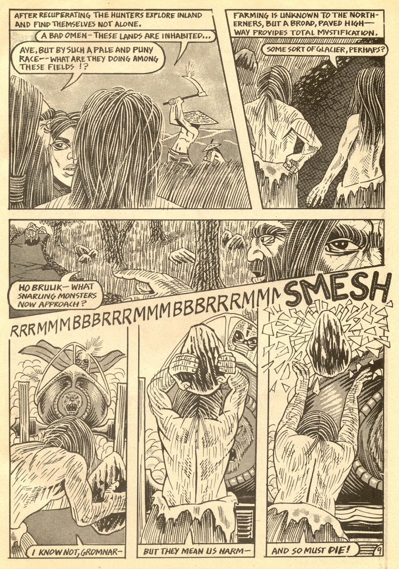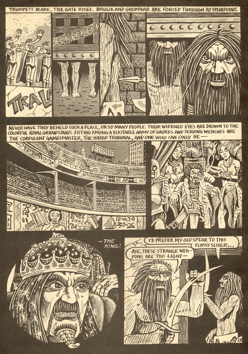 Psychotic Adventures #2 features a single, untitled story that’s fairly unique in Dallas’ body of work. It’s about a small group of a primitive arctic tribe (the Snow Bear Tribe) who acrimoniously split off from their tribemates to venture south and find better hunting grounds. Their long journey is grueling, dangerous and deadly: the group dwindles from ten to six and eventually down to three. When the surviving members, Brulik, Gromnar and Ildra, finally reach a more bountiful land, they are soon captured and held prisoner by a (relatively) technologically advanced civilization known as “the city-state of Xamon.”