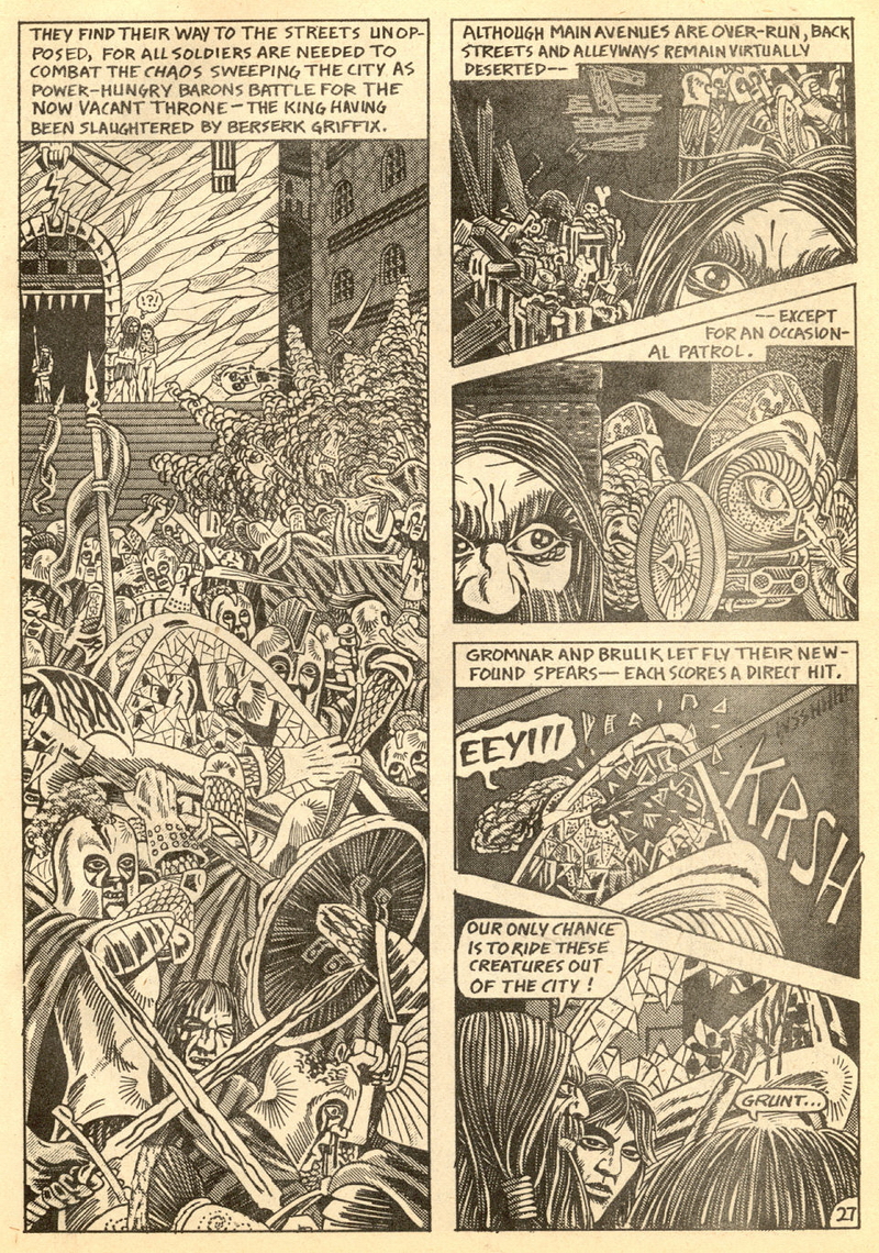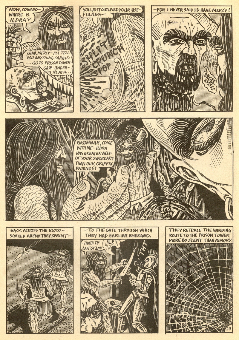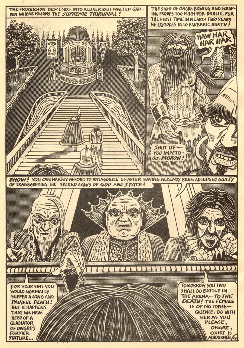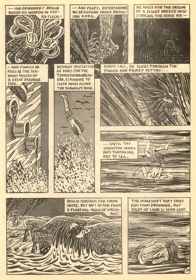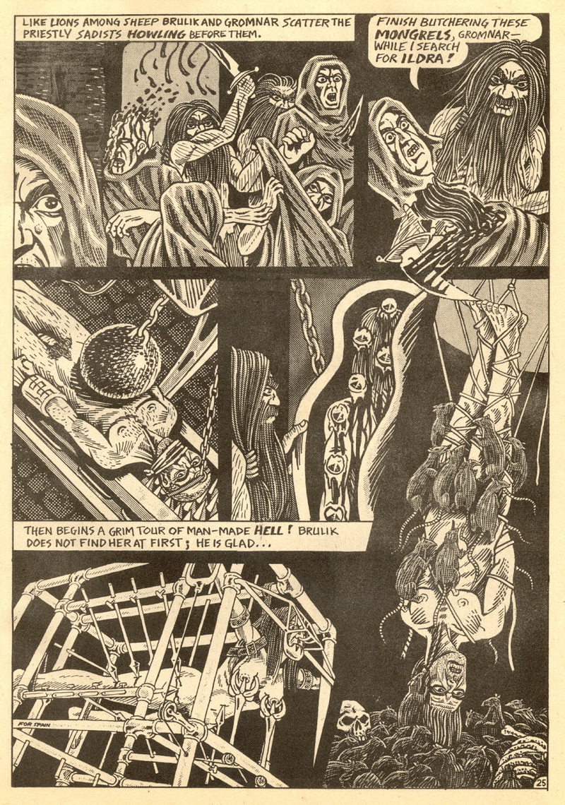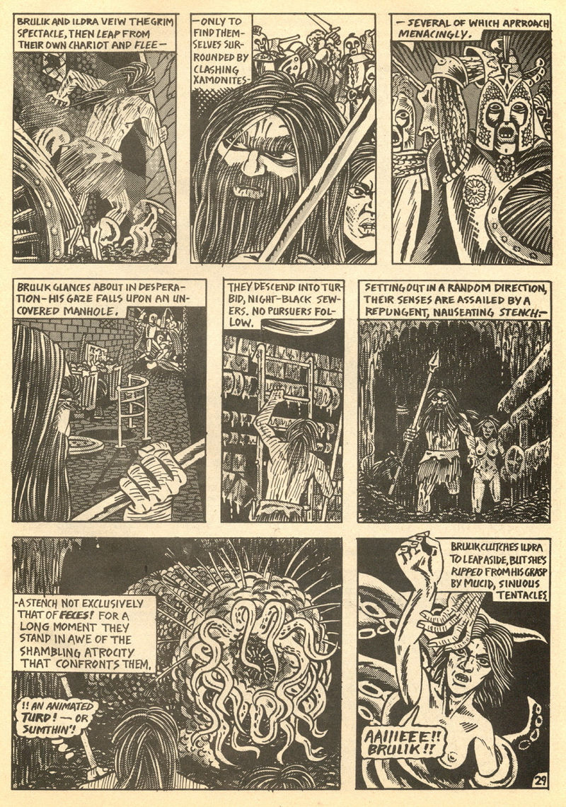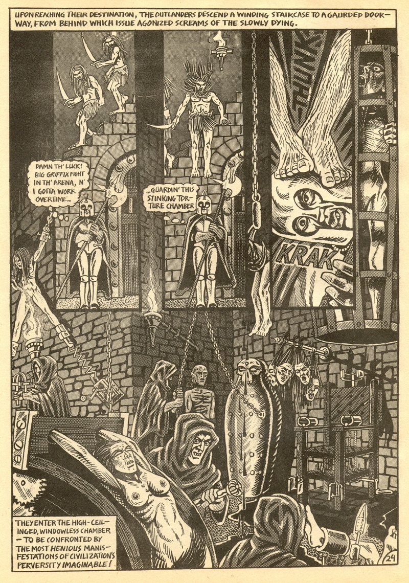 Psychotic Adventures #2 features a single, untitled story that’s fairly unique in Dallas’ body of work. It’s about a small group of a primitive arctic tribe (the Snow Bear Tribe) who acrimoniously split off from their tribemates to venture south and find better hunting grounds. Their long journey is grueling, dangerous and deadly: the group dwindles from ten to six and eventually down to three. When the surviving members, Brulik, Gromnar and Ildra, finally reach a more bountiful land, they are soon captured and held prisoner by a (relatively) technologically advanced civilization known as “the city-state of Xamon.”