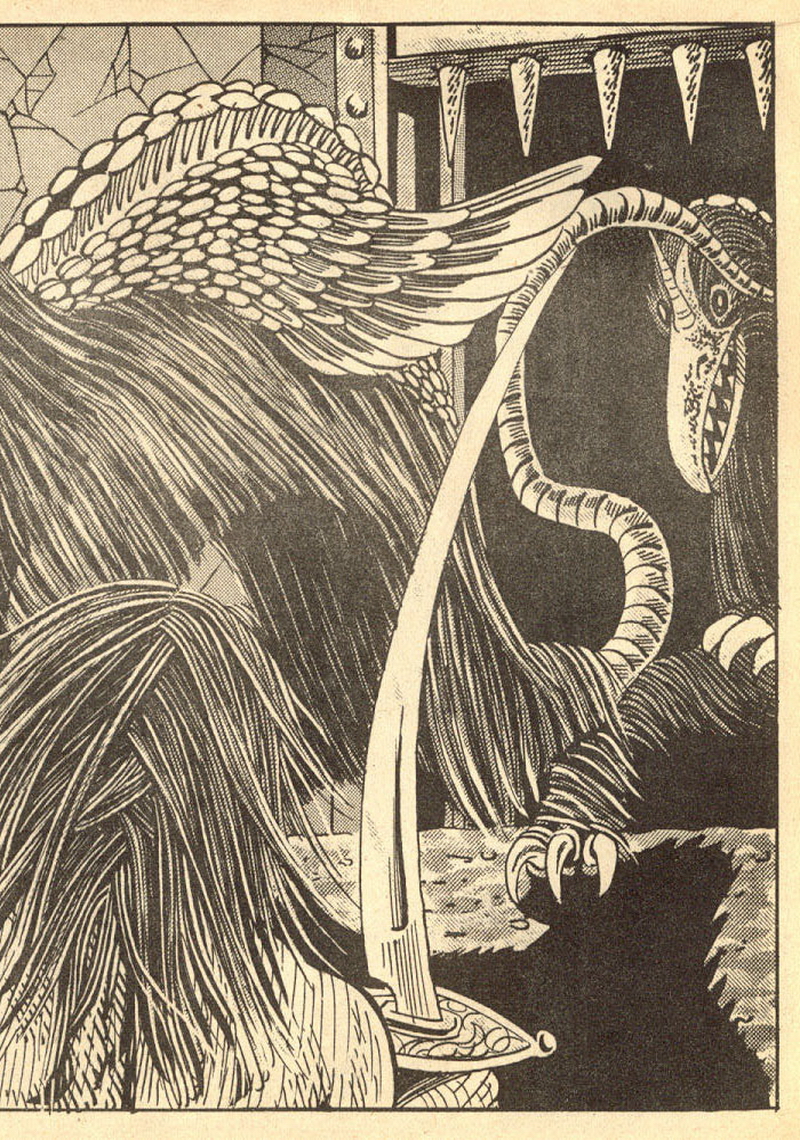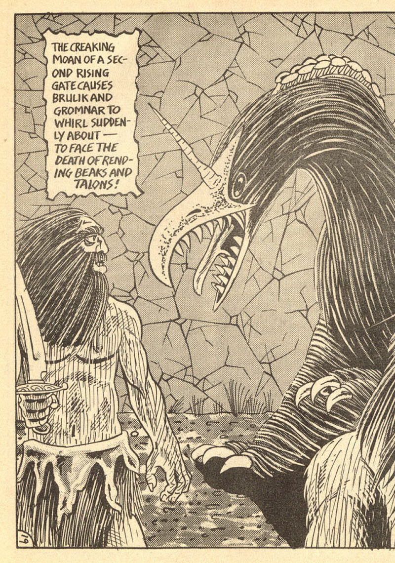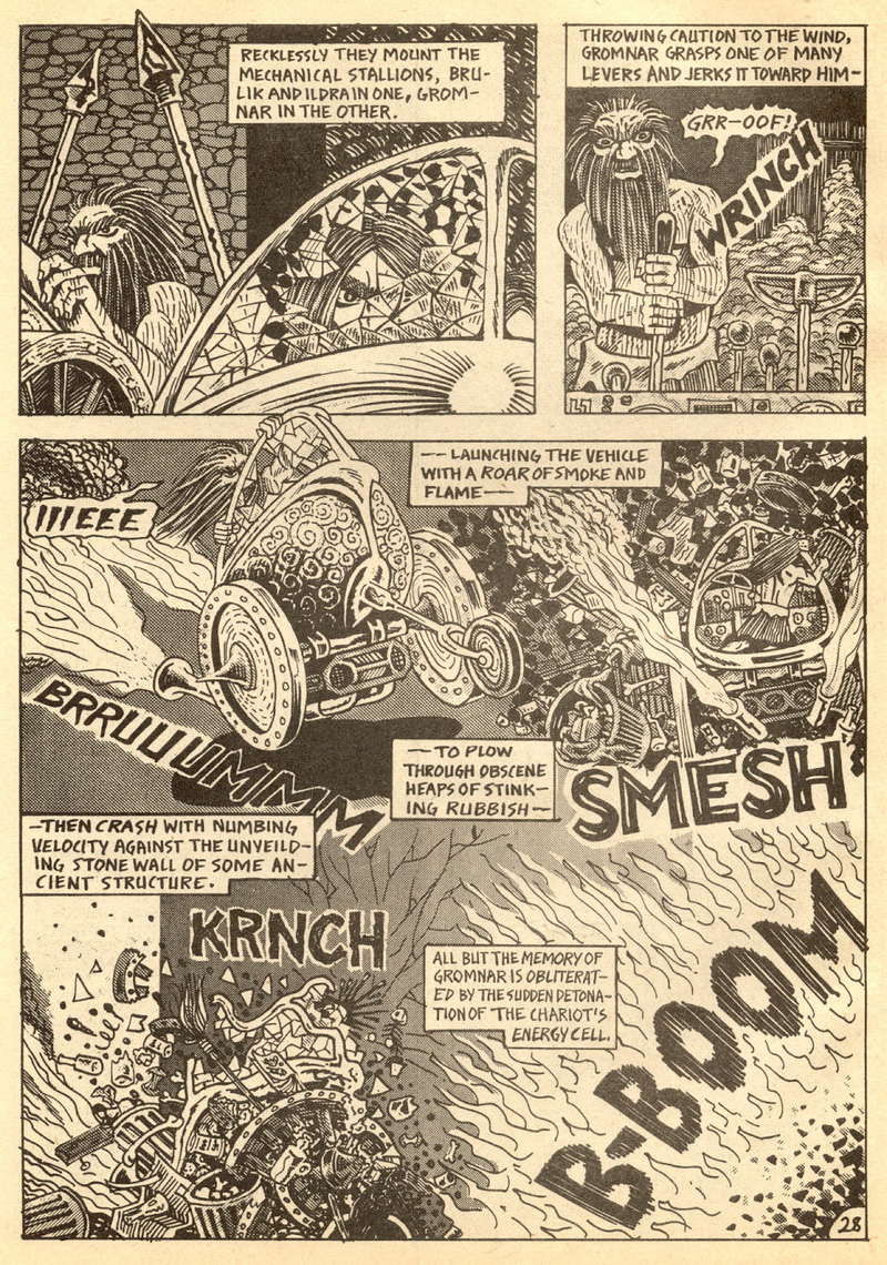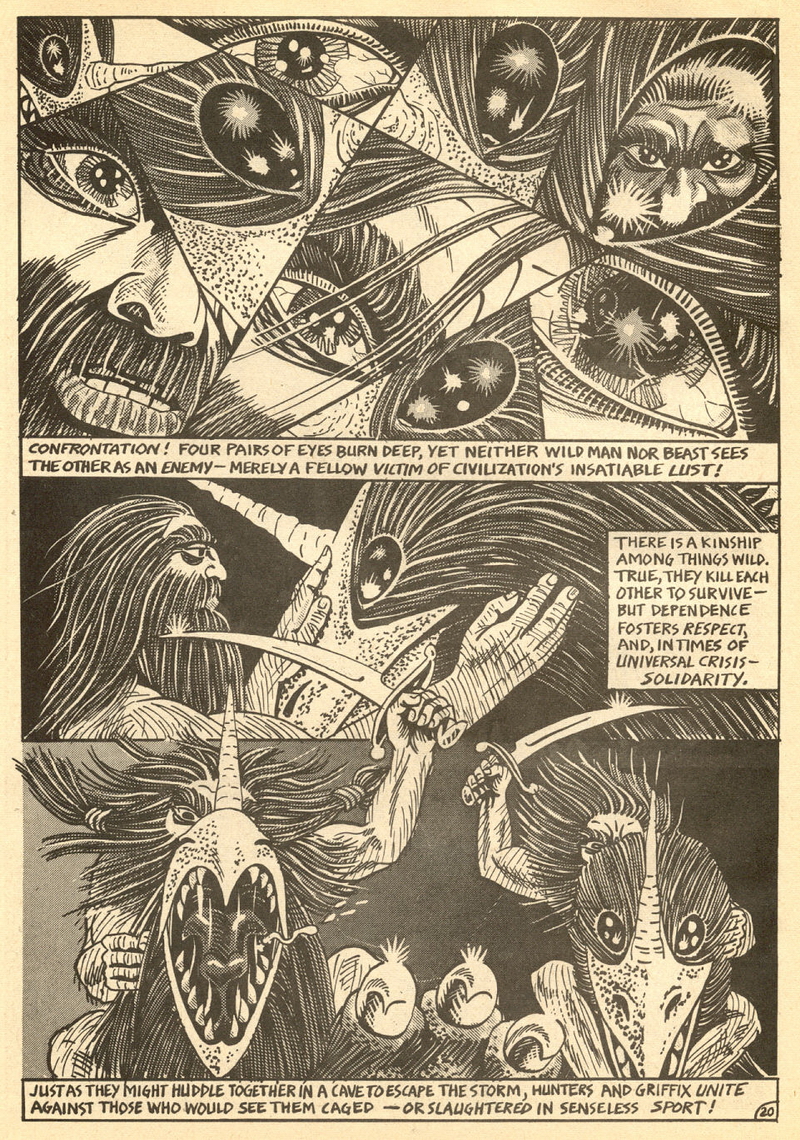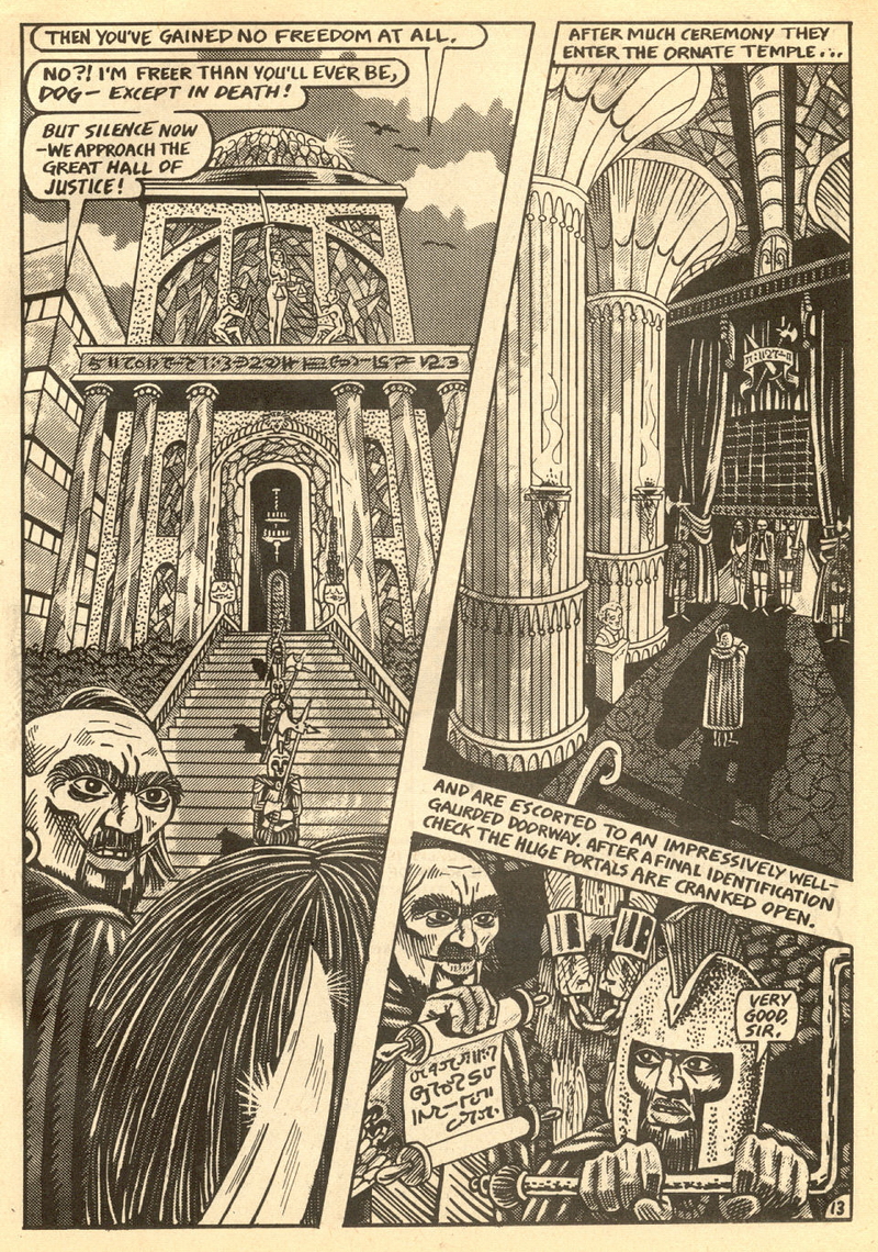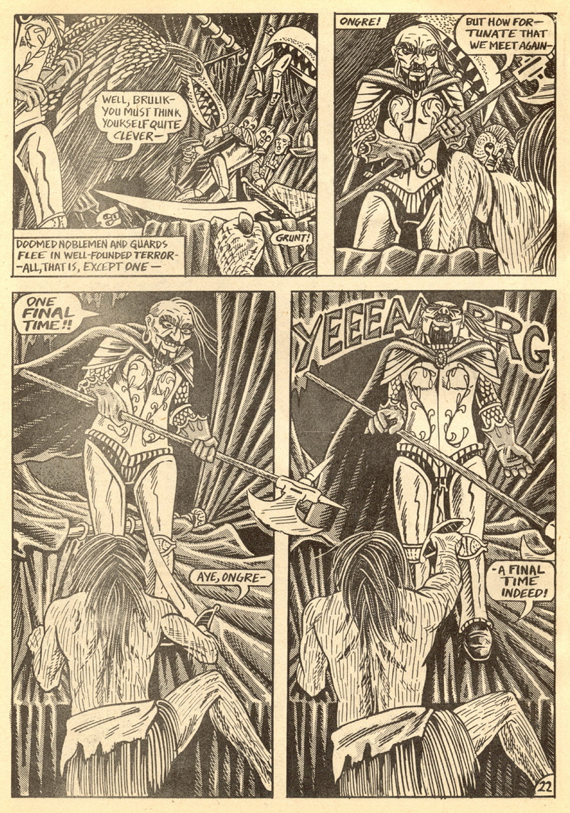 Psychotic Adventures #2 features a single, untitled story that’s fairly unique in Dallas’ body of work. It’s about a small group of a primitive arctic tribe (the Snow Bear Tribe) who acrimoniously split off from their tribemates to venture south and find better hunting grounds. Their long journey is grueling, dangerous and deadly: the group dwindles from ten to six and eventually down to three. When the surviving members, Brulik, Gromnar and Ildra, finally reach a more bountiful land, they are soon captured and held prisoner by a (relatively) technologically advanced civilization known as “the city-state of Xamon.”
